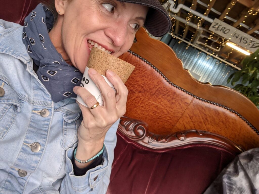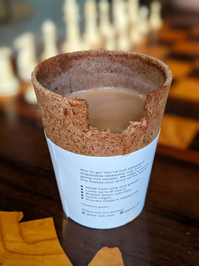 Then we heard about Good Edi, an edible coffee cup that was invented right here in Melbourne. It is vegan and made of oats and grains. I really wanted to try it, so we popped over to the Into Coffee, a zero waste café in the Fitzroy neighborhood. After a few sips of delicious coffee sourced from Industry Beans (we also buy direct from them for our coffee at home), then we were able to take a bite of the cup. It was nice, it tasted like a less-sweet, crunchy waffle cone. Plus, it was fun having a biscuit with my coffee!