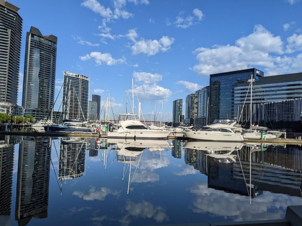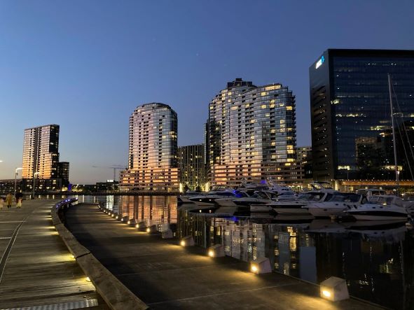 Docklands, on the Yarra River, is a recently redeveloped dock area a stone’s throw from the CBD. The docks are surrounded by high rise apartments, office buildings, bars, and cafés. There is a marina, boats, and nice walkways for pedestrians.